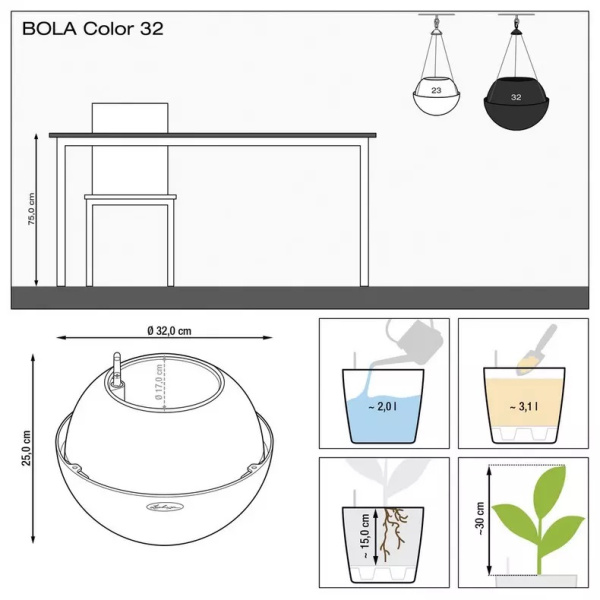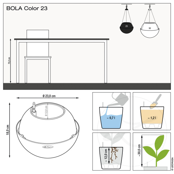 Květináče Bola Color jsou vyrobeny z probarvovaného plastu s jemným elegantním rýhováním. Vyrábějí se ve dvou velikostech a třech barvách. Balení obsahuje závěsný nerezový systém s nosností až 3,5 kg u BOLA 23 a nosností 8,5 kg u BOLA 32. Komplet obsahuje barevný obal, vyjímatelnou sázecí vložku, samozavlažovací set se sáčkem Lechuza PON na drenážní vrstvu a závěsný systém se 3 kusy nerezových lanek.
