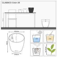 Květináče Classico Color jsou vyrobeny z probarveného plastu a mají matný povrch. Vyrábějí se v deseti velikostech a šesti barvách. Vzhledem k tomu, že mají zabudovaný přepad a vypouštěcí ventil, je možné je použít nejen v interiéru, ale také ve venkovním prostředí, kde je nutné vyšroubovat vypouštěcí ventil pro možnost odtoku přebytečné dešťové vody. Komplet obsahuje barevný obal a samozavlažovací set se sáčkem Lechuza PON na drenážní vrstvu. Pro velikosti 43, 50, 60 a 70 je možné dokoupit kolečka.