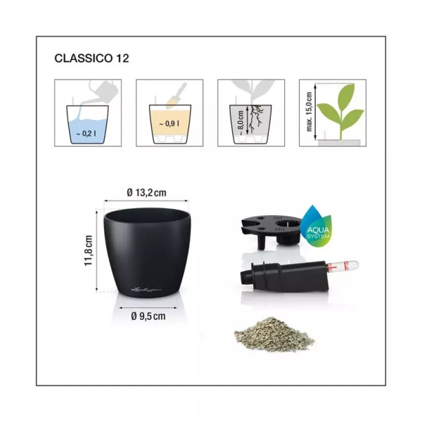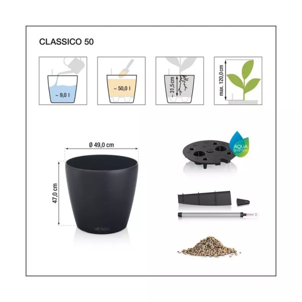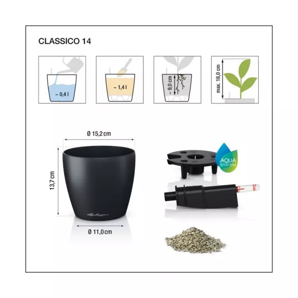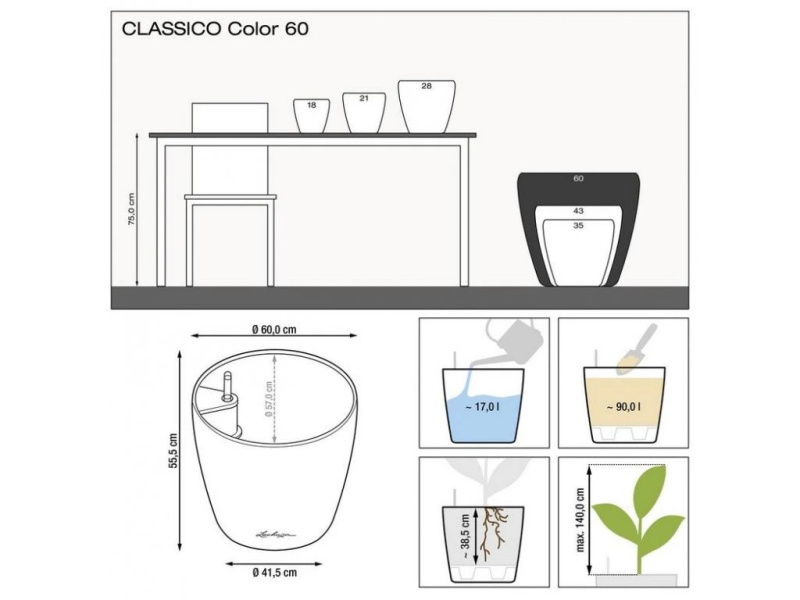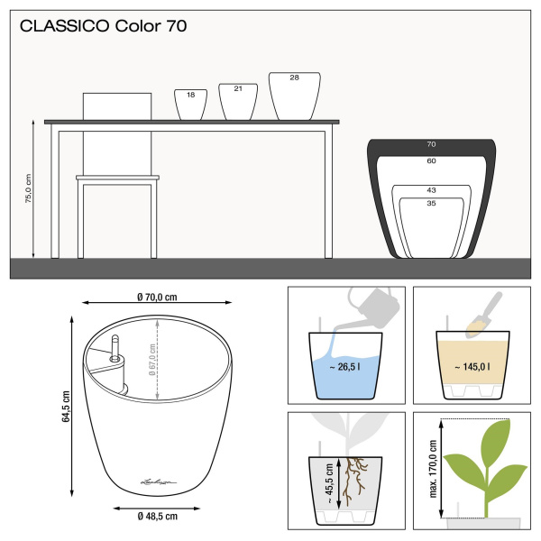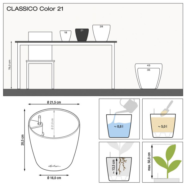 Květináče Classico Color jsou vyrobeny z probarveného plastu a mají matný povrch. Vyrábějí se v deseti velikostech a šesti barvách. Vzhledem k tomu, že mají zabudovaný přepad a vypouštěcí ventil, je možné je použít nejen v interiéru, ale také ve venkovním prostředí, kde je nutné vyšroubovat vypouštěcí ventil pro možnost odtoku přebytečné dešťové vody. Komplet obsahuje barevný obal a samozavlažovací set se sáčkem Lechuza PON na drenážní vrstvu. Pro velikosti 43, 50, 60 a 70 je možné dokoupit kolečka.